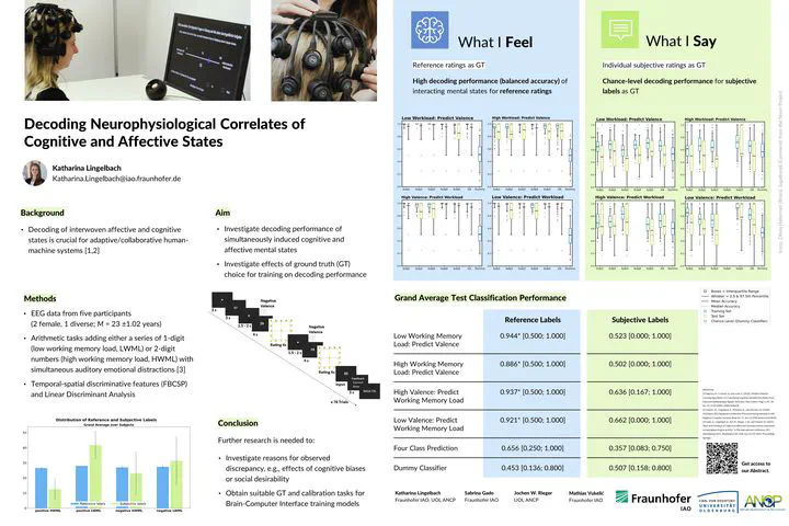 For neuroergonomic applications, robust decoding of activation patterns indicating current affective or cognitive states is a crucial step to develop adaptive and collaborative human-machine systems leading to increased performance, safety, and user experience [1-6]. So far, most studies attempting to estimate affective and cognitive states from electroencephalographic (EEG) signals used strictly controlled stimuli and tasks to induce a single, isolated mental state. Classification results by machine learning models were promising when estimating workload but rather modest to poor when estimating affective-emotional states [4]. However, in naturalistic environments, we are seldom confronted with isolated stimuli resulting in one mental state but rather experience a composition of interwoven affective and cognitive states in response to complex stimuli. Especially in naturalistic applications, choosing a good approximation to the ground truth that adequately represents a person’s true mental states is decisive step when training decoding models. The ground truth can either be estimated based on characteristics of the experimental condition (i.e., hypothetically estimated) or by asking participants to provide labels based on their experiences via post-hoc ratings or questionnaires. In this study, we investigate decoding performance of simultaneously induced cognitive and affective mental states with a filter-bank common spatial pattern (FBCSP) and linear discriminant analysis (LDA) approach [4,7]. In addition, we are interested how decoding performance changes when using subjectively rated labels instead of the experimentally induced labels.